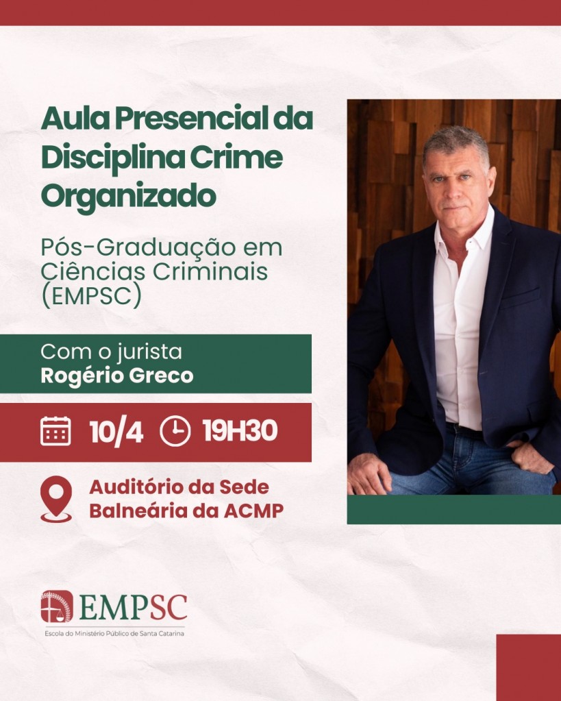 No dia 10 de abril, a partir das 19h30, a Escola do Ministério Público (EMPSC) promove um encontro acadêmico com um dos maiores doutrinadores do Direito Penal brasileiro: o jurista Rogério Greco. A aula presencial integra o cronograma da Pós-Graduação em Ciências Criminais e abordará o tema Crime Organizado, oferecendo aos alunos uma oportunidade rara de imersão técnica com uma referência nacional na área.