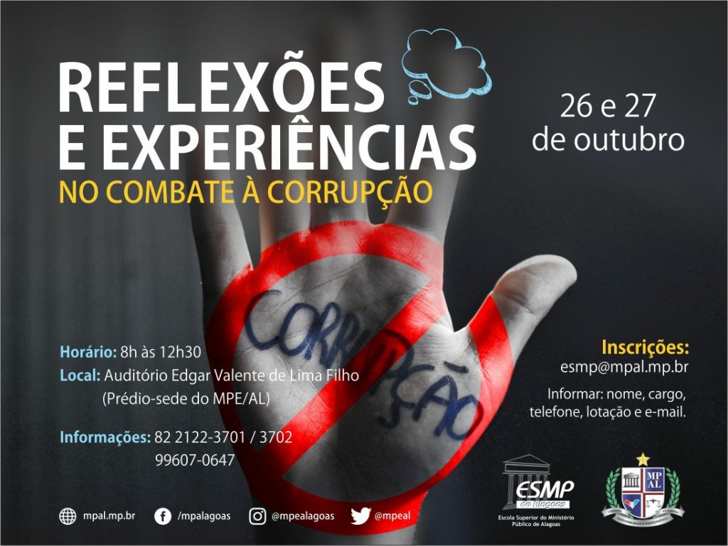 O curso será realizado nas manhãs dos dias 26 e 27 de outubro no Auditório Edgar Valente de Lima Filho, no Prédio Sede do MPE/AL. O evento irá abordar temas como técnicas de negociação na colaboração premiada e transparência no poder legislativo. As inscrições podem ser feitas por meio do e-mail: esmp@mapal.mo.br.