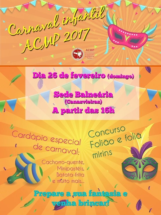 Contagem regressiva para a diversão! No próximo domingo (26/2), a partir das 16h, a Sede Balneária da ACMP será invadida pelos pequenos foliões em mais uma edição do “Carnaval Infantil”. Com o tema “Brincadeira de criança”, a festa será repleta de guloseimas, com o cardápio especial de carnaval, e também de música e dança, com nosso DJ convidado. Os pequenos também poderão participar do nosso tradicional concurso “Folião e Foliã Mirins”, então é bom caprichar na fantasia. Reúna a criançada e participe!