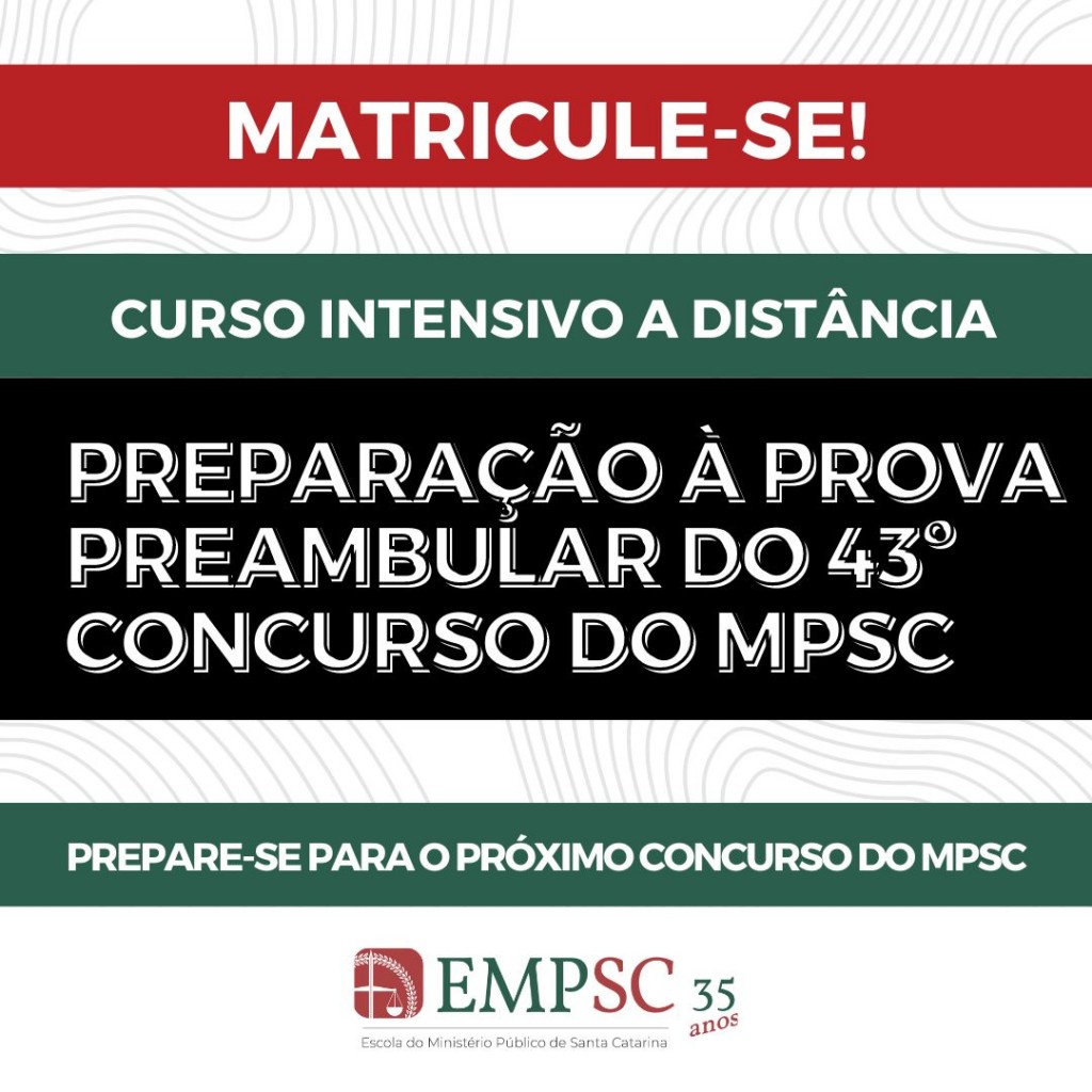 A Escola do MPSC está com matrículas abertas para o Curso Intensivo de Preparação à Prova Preambular Objetiva do 43º Concurso do MPSC, na modalidade a distância! As inscrições vão até o dia 30 de janeiro, com início das aulas no dia 2 de fevereiro. São cinco módulos - Civil/Processo Civil, Penal/Processo Penal, Público, Coletivo e Leis Especiais. As aulas acontecem de segunda a sexta, das 19h às 22h30.
